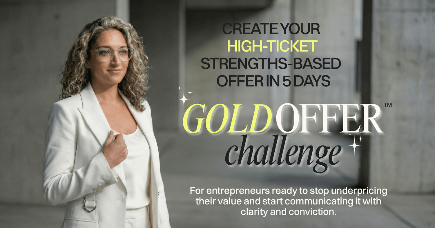 The all new GOLD OFFER™ CHALLENGE is a 5-day experience designed to help you claim your strengths, communicate your value, and build a high-ticket offer that reflects who you are and what you're capable of delivering.